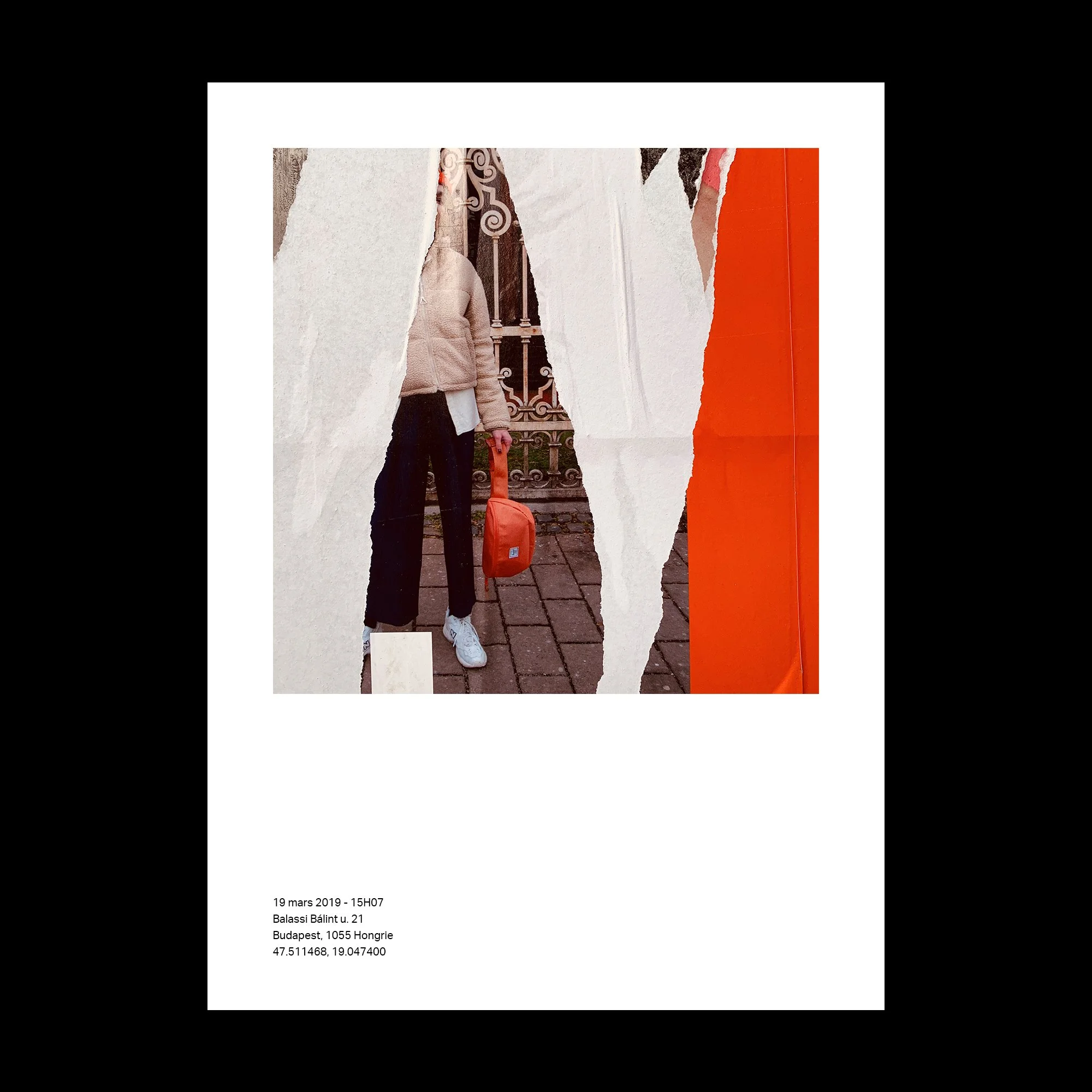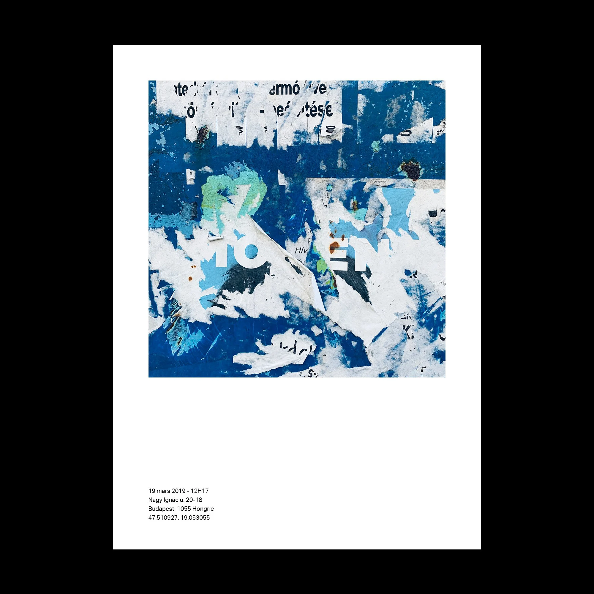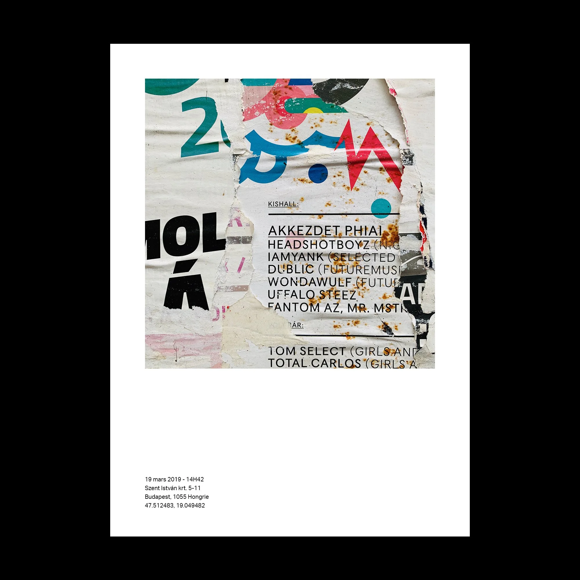"Lines and traces. Maps and territories." This series of photographs captures torn posters and graffiti in Budapest, documenting a walk along the city streets on March 19, 2019. Annotated with addresses and GPS coordinates, these photographs represent space through lived experience. Rather than showing the experience itself, they reveal subjective traces of memory, shaped by ephemeral human marks. This personal mapping offers an alternative, fleeting journey of discovery, preserving the memory of a single day’s visual experience.